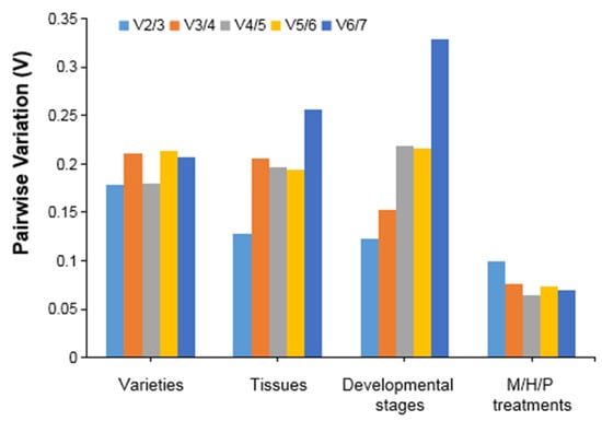 Pairwise variation (V) analysis of the seven candidate reference genes in all tested samples. M/H/P treatments means MT, HBR or PP treatments.