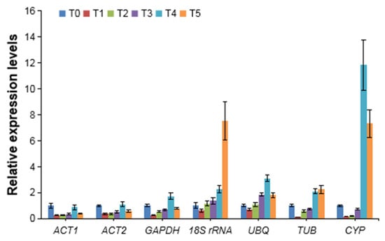 Ideally, the reference gene should be independent of experimental factors and maintain stable transcript levels in all types of tissues and cells [,]. However, the study has shown that there is no absolute constant expression of a reference gene that is suitable for all experimental conditions, and that any one reference gene is only relatively consistently expressed under limited conditions []. The use of inappropriate reference genes for normalization can lead to bias in the quantitative data []. In order to obtain more reliable results, one or more reference genes need to be selected for calibration in the experiment [,].