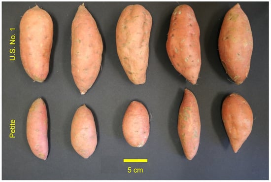 Petite sweetpotatoes are of smaller diameter (3.8–5.7 cm) and length (7.6–17.8 cm), with no defined weight requirement when compared to U.S. No. 1’s; however, they are subject to the same quality standards (Figure 1). Over the past several years, the Petite sweetpotato has gained market attention throughout the U.S. mainly because Petite storage roots (i.e., fingerling sweetpotato; baby sweetpotato) are easier to handle and faster to cook when compared to U.S. No. 1 roots [6]. Typically, Petite sweetpotatoes are packed in special microwavable or steamable bags (4 to 6 storage roots per bag) or in small mesh bags (6 to 10 storage roots per bag) and sold at premium prices at supermarkets, specialty grocery stores and farmers markets, among others.