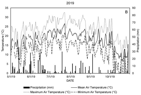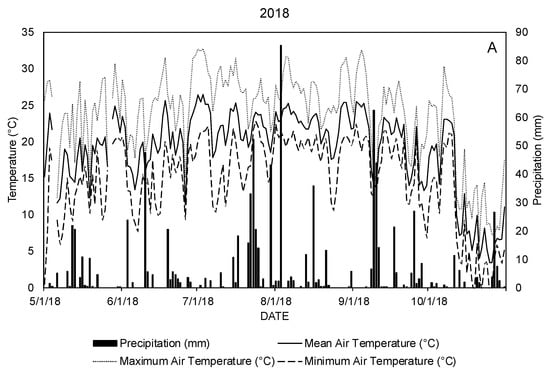 Daily precipitation, maximum, minimum, mean air temperatures, and GDD data are presented for the 2018 and 2019 growing seasons for Rock Springs, PA (Figure 2, Table 1). This information is offered to illustrate the environmental differences for both years during the experimental period and to offer an estimation of shifting weather patterns for the region. Specifically, 2018 was warmer and rainier compared to 2019 which displayed somewhat cooler and drier climate representative of this region. Particularly, Pennsylvania recorded the rainiest July (2018) in recorded history, with a mean precipitation of 19.1 cm and a 6-month mean of 15.9 cm (May–October). In 2018, mean air-temperature averaged 21.1 °C (4-month mean, June–September) compared with 19.8 °C in 2019 [7].