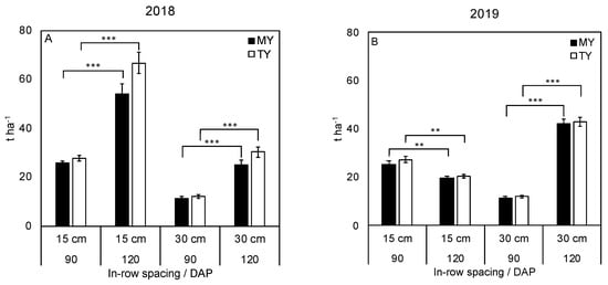 Main effects of in-row spacing and days after planting on total and marketable yields of sweetpotato for the 2018 (A) and 2019 (B) field seasons. Error bars are one standard error from the mean. Statistically significant comparisons are indicated on the graphs with ** and *** denoting, respectively a p-value ≤ 0.01 and 0.001. DAP = days after planting; TY = total yield; MY = marketable yield.