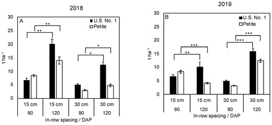 Main effects of in-row spacing and days after planting on U.S. No. 1 and Petite sweetpotato roots for the 2018 (A) and 2019 (B) field seasons. Error bars are one standard error from the mean. Statistically significant comparisons are indicated on the graphs with *, ** and *** denoting, respectively a p-value ≤ 0.05, ≤0.01 and 0.001. DAP = days after planting.