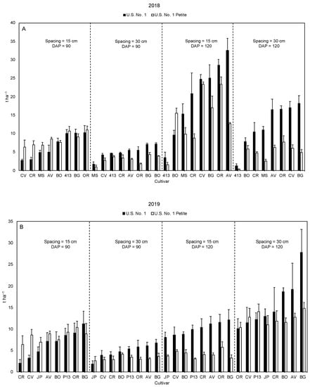 The yield of U.S. No. 1 and Petite sweetpotato roots under 15 cm and 30 cm in-row spacing and harvested at 90 or 120 days after planting in the 2018 (A) and 2019 (B) field season. Varieties are ‘Averre’ (AV), ‘Beauregard’ (BG), ‘Bonita’ (BO), ‘Carolina Ruby’ (CR), ‘Covington’ (CV), ‘Murasaki’ (MS), ‘NC413’ (413), ‘Orleans’ (OR), ‘Japanese’ (JP), and ‘NCP13-0030’ (P13). DAP = days after planting.