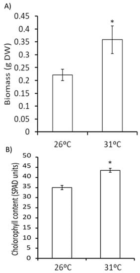 The influence of mild heat stress on plant growth was analyzed, and we observed that T31 °C plants displayed a statistically significant increase of 37.5% of total biomass compared with control plants. Moreover, the T31 °C plants developed a darker green color, and their chlorophyll content was 19.58% higher than that in T26 °C plants (Figure 1).