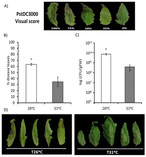 The effect of mild temperature stress on a tomato–PstDC3000 pathosystem. Four-week-old tomato plants grown at T26 °C and T31 °C were inoculated with PstDC3000. This was performed by dipping the leaves in a bacterial suspension at 5 × 105 c.f.u. mL−1. Diseased leaves were determined 72 hpi using the visual damage score shown in the photograph (A). Infection levels were measured as a percentage of the infected leaf surface in relation to the total number of analyzed leaves (B) and by recounting of bacterial populations by plating in agar–KB medium 72 hpi (C). The photograph shows a representative picture of disease symptoms under different temperature scenarios (D). Data show the average of three independent experiments, with a pool of 10 plants per experiment ± SE. An asterisk indicates statistically significant differences (p < 0.05; LSD test).