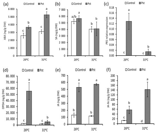 The hormonal profile and marker genes were analyzed simultaneously in T26 °C and T31 °C plants at 48 hpi. There were no significant changes in hormonal levels in plants adapted to moderate heat stress in the absence of PstDC3000. However, T31 °C plants displayed an increase in abscisic acid (ABA) content when compared with the control conditions after infection with PstDC3000 (Figure 3a). These plants also showed significant reduction in SA levels. This correlates with a strong reduction in PR1 expression when compared with T26 °C plants (Figure 3b,c). T26 °C plants displayed an increase in 12-oxo-phytodienoic acid (OPDA) and JA content in the oxylipin pathways after PstDC3000 infection (Figure 3d,e). No OPDA increase was observed in T31 °C-infected plants; however, these plants accumulated JA and JA-isoleucine (JA-Ile) at 48 hpi (Figure 3d,f).