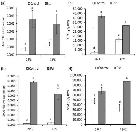 The effect of moderate heat stress on the polyamines biosynthetic pathways in T26 °C and T31 °C plants was analyzed. We observed an induction of arginine decarboxylase (ADC) gene expression, which correlates with a significant accumulation of putrescine in T31 °C tomato leaves, in the absence of PstDC3000 infection (Figure 4a,c). T26 °C and T31 °C plants displayed an induction of ADC gene expression in response to PstDC3000 infection. Moreover, putrescine accumulation in leaves increased at 48 hpi in both conditions, and this accumulation was more pronounced in control plants (Figure 4a,c). We also observed an induction of the spermidine synthase gene in T26 °C- and T31 °C-infected plants at 48 hpi, as well as accumulation of spermidine, which was more concentrated in T31 °C plants (Figure 4b,d).