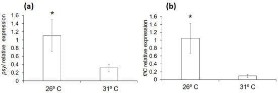 High temperatures reduce the expression of genes involved in QS establishment and in flagellin synthesis. The relative expression of psyI (a) and fliC (b) was determined by qRT-PCR in bacteria extracted from plants grown at 26 °C or 31 °C. The relative expression levels of psyI and fliC were normalized to those of recA. The results are shown as means ± SE from three different experiments. An asterisk indicates statistically significant differences (p < 0.05).