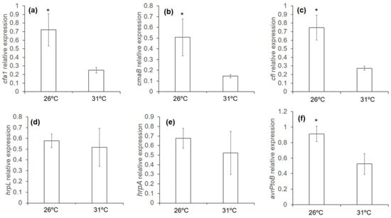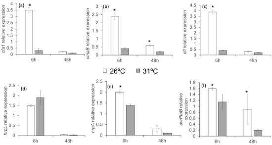 Furthermore, there was a repression of genes involved in the synthesis of COR at 31 °C, mainly at short time points, when compared to their expression at 26 °C (Figure 9a–c). These results indicate a possible negative role for the synthesis of this molecule in bacteria under these conditions. The expression of genes involved in the synthesis of the T3SS and avrPtoB effectors was also studied. An increase in the expression of HrpL was observed at 6 h in bacteria grown at 31 °C compared with bacteria grown at 26 °C (Figure 6d). However, the difference was not significant. There were significant differences in the expression of hrpA and avrPtoB genes (Figure 9e,f) at 6 h, and in both cases, the expression was lower at 31 °C. The expression of hrpA was 1.4 times lower in the bacteria grown at 31 °C for short periods. However, the reduction in the expression of these genes was not as strong as that of the COR synthesis genes.