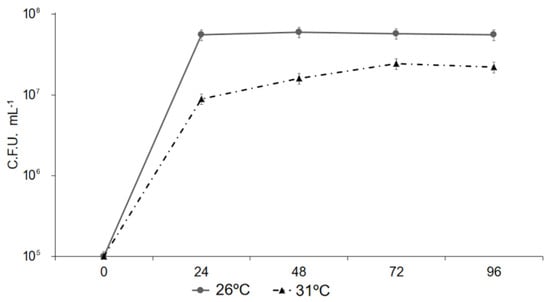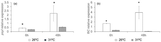 We analyzed the expression of the genes in vitro to check whether high temperatures had the same effect in vitro. The expression of the psyI gene was lower in bacteria grown at 31 °C than at 26 °C. The difference was more pronounced at 48 h, and a similar behavior was observed for the fliC gene (Figure 8).
