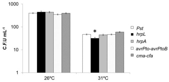 The effect of high temperatures on the growth of different PstDC3000 mutants in vitro. PstDC3000 mutants defective in COR synthesis (Δcma-cfa), in T3SS synthesis and assembly (ΔhrpL), in pillus formation (ΔhrpA), and in effector synthesis (ΔavrPto-ΔavrPtoB) were grown in liquid KB medium at 26 °C and 31 °C. The optical density at 600 nm was measured 24 hpi. The results represent the mean of three independent experiments with 8 replicates per mutant in each experiment. An asterisk indicates statistically significant differences (p < 0.05).
