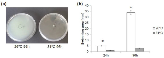 On the basis of the results of flagellin synthesis, we tested whether PstDC3000 low mobility was due to the high temperatures. The swimming ability of the bacterium was tested at 26 °C and 31 °C. This ability was almost completely reduced at high temperatures (Figure 11). The plates from the tests at high temperatures were incubated at 26 °C to check whether this effect was reversible. The bacteria regained their swimming ability to the same levels as those maintained at 26 °C.