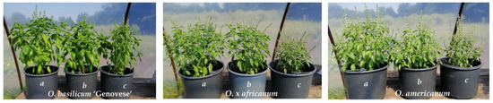 The genus Ocimum is characterized by great variability in both morphology and chemical composition due to polyploidy, aneuploidy, and inter-and intraspecific hybridizations [15,56,57]. The studied species also showed variation in morphology and chemical compositions under optimum water supply. The sweet basil cultivar Genovese had an upright growth, large leaf area, higher biomass yield, and more linalool. O. x africanum produced more essential oil, glandular hair density, TPC, and AOC. The African basil accumulated more 1,8-cineole and camphor. Whereas the third species, O. 10mericanum, had a spreading growth habit, narrow leaves, and higher ratios of neral and geranial.