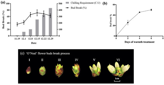 For artificial warming accumulation, on 29 December 2018, 1 year old shoots (flower buds at the endodormancy stage) of O’Neal trees were collected, incubated at 15 °C for 3 d, and then transferred to 25 °C. The shoots were kept following the conditions described in Section 2.2. After 6, 12, 18, and 24 h, 30 flower buds were collected and frozen in liquid nitrogen. Tissues were stored at −80 °C for later use. Other shoots were exposed to forcing conditions for bud break measurements. Three biological replicates were performed for all the above treatments.