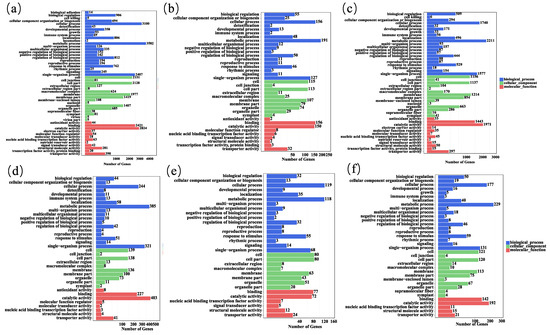 GO enrichment diagrams. (a–f) represents the secondary GO term annotation for DEGs in Dec. 8 vs. Nov. 19, Dec. 29 vs. Dec. 8, 6 h vs. Dec. 29, 12 h vs. 6 h, 18 h vs. 12 h, and 24 h vs. 18 h respectively.