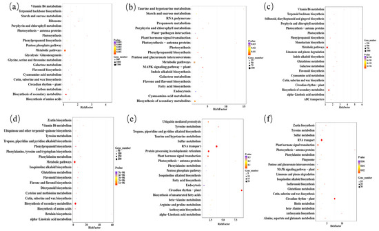 KEGG pathway enrichment results of DEGs. The ordinate represents pathway entry, and the abscissa represents the rich factor. Dots represent significant DEG classes, and the size of a dot represents the number of significant DEGs in that class. The larger the dot, the greater the number of significant DEGs. Different colored dots represent different p values. (a–f) represents the pathways for DEGs in Dec. 8 vs. Nov. 19, Dec. 29 vs. Dec. 8, 6 h vs. Dec. 29, 12 h vs. 6 h, 18 h vs. 12 h, and 24 h vs. 18 h respectively.