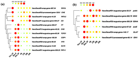 The circadian rhythm is thought to be important in the regulation of dormancy onset and release in some species, and we found DEGs that were significantly enriched in the circadian rhythm pathway during the process of dormancy release. Consequently, we focused on genes involved in the circadian rhythm to validate their roles in blueberry flower bud dormancy release. A total of 85 DEGs related to circadian rhythm were found in the comparison of Dec. 8 vs. Nov. 19 (Supplementary Table S5). We selected 11 representative genes and analyzed their expression patterns; the results indicated that the expression levels of a large number of circadian-rhythm-related genes differed from endodormancy to endodormancy release, e.g., FT: Vaccdscaff28-snap-gene-259.27; ELF3: VaccDscaff36-snap-gene-15.50; HY5: VaccDscaff28-snap-gene-90.32; and CO: VaccDscaff1-augustus-gene-404.27. As shown in Figure 5a, the expression patterns of circadian rhythm genes were grouped into two categories, with one group downregulated and the other upregulated during endodormancy release, for which CO and FT are examples, respectively. The expression level of CO was high in the endodormancy stage, and that of FT was low. The expression of the CO gene was downregulated during the endodormancy release, while the change of expression of FT was opposite. The results showed that their expression patterns are negatively correlated and FT may be inhibited by CO. During the transition of ecodormancy release, the expression levels of COP1, TCP21, and HY5 were downregulated from 18 h to 24 h, while other genes’ expression levels were upregulated with warm treatment.