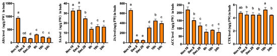 The phytohormone (ABA: abscisic acid, SA: salicylic acid, JA: jasmonic acid, ACC: 1-aminocyclopropane-1-carboxylic acid, and CTK: cytokinin) extraction was done following a previously described method [32]. A 100 mg aliquot of ground tissues was mixed with 1 mL of 80% methanol with internal standards (45 pg of 2H5-tZ, 2H5-tZR, 2H6-iP, 2H6-iPR, and 100 pg of [2H6] ABA), and subsequently extracted twice using a laboratory rotator for 2 h at 4 °C. After centrifugation (10 min, 15,000× g, and 4 °C), the supernatant was collected and dried with nitrogen gas. The pellet was then resolved in 300 μL of 30% methanol and filtered through a filter membrane (0.22 μm).