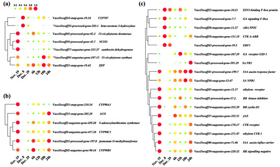 Analysis of changes in the expression levels of key genes in different hormone metabolic pathways. Each column represents a different sampling point, and each row represents a gene. The mean expression values were calculated using 0 to 1. Genes and expression patterns were hierarchically clustered based on the average Pearson’s metric. Red indicates high expression and blue indicates low expression. (a) Key differentially expressed genes in the ABA biosynthesis pathway. (b) Key differentially expressed genes in the ethylene, JA, and BR biosynthesis pathways. (c) Key differentially expressed genes in the plant hormone signal transduction pathway.
