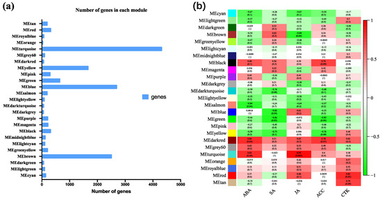 Coexpression module analysis. (a) The number of genes in each module. (b) Diagram of associations between gene modules and hormone contents. The X axis represents the information of each phenotype value and the Y axis represents the module. Red indicates a positive correlation, green indicates a negative correlation, and a correlation value close to 1 indicates a high correlation. The p-value of each significant correlation is shown in parentheses.