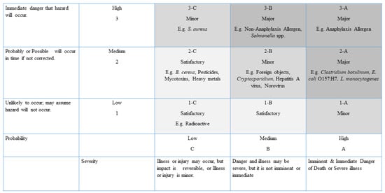 The United States Food and Drug Administration (US FDA) document “Qualitative Risk Assessment: Risk of Activity/Food Combinations for Activities (Outside the Farm Definition) Conducted in a Facility Co-Located on a Farm” in August 2015 [23] was used as a fruit and vegetable risk profile reference, based on the hazards summarized in Tables 16 and 17 of the document. Low, medium, and high levels were defined compatible with a 3 × 3 qualitative risk matrix model.
