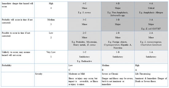 The practical fruit and vegetable 5 × 5 qualitative food safety risk matrix model gave the highest compatibility with Tables 16 and 17 [23]. The 3 × 3 qualitative food safety risk matrix model gave compatible results for five of the seven significant hazards, and all of the non-significant hazards in Tables 16 and 17 [23]. In contrast, in the 4 × 3 qualitative food safety risk matrix model, only three of the seven significant hazards were compatible with Tables 16 and 17 [23].
