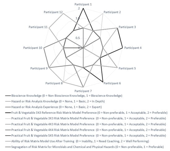 All practical fruit and vegetable qualitative food safety risk matrix models were tested for preference by 12 participants of a focus group [27,31] after training them in the use of these models. Overall, six persons of non-bioscience knowledge and another six persons of bioscience knowledge from five fruit and vegetable business organizations were trained in using the models. The results are shown in Table 7 and Figure 5.