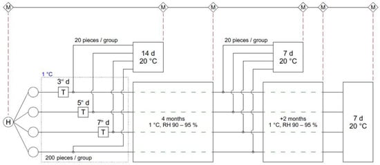 The 1-MCP application procedure followed as it was earlier published by Nguyen et al. [5]. Samples were kept at 1 °C before 1-MCP treatment. Three groups were treated with 1-MCP gas on the 3rd, 5th and 7th d after harvest, respectively, in an air-tight chamber at 1 °C for 24 h (Figure 1).