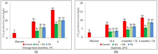 Effect of delay application of 1-MCP treatment on carbon dioxide production of pear during cold storage (i) and shelf life (ii). Presented values are mean ± SD. Upper case is for the comparisons of time (Tukey’s, p < 0.05). Lower case is for the comparisons of treatment (Tukey’s, p < 0.05).