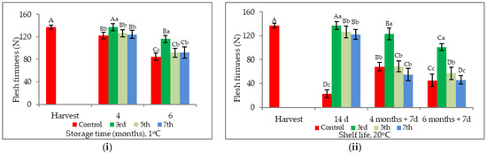 Effect of delay application of 1-MCP treatment on flesh firmness of pear during cold storage (i) and shelf life (ii). Presented values are mean ± SD. Upper case is for the comparisons of time (Tukey’s, p < 0.05). Lower case is for the comparisons of treatment (Tukey’s, p < 0.05).