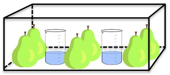 Since α-farnesene oxidation is one of the main biochemical reactions responsible for the appearance of scald symptoms [5], it was our objective to create a simple and fast model system to induce SC damage through the application of the α-farnesene isomer, β-farnesene, under a controlled temperature (25 °C). Various attempts to find the optimal β-farnesene volume, to induce SC in the manner of the naturally occurring SC, in the 5 L headspace boxes were performed (data not shown). The optimization of β-farnesene volume was carried out because we observed that much higher volumes than 150 mL led to the rapid injury of the fruit skin. As it was used in the case of the pure substance in a closed system and considering the vapor pressure 1.333 Pa at 25 °C [38], the more energetic β-farnesene molecules diffused, i.e., evaporated, from the liquid to the gaseous phase until reaching saturation. This equilibrium allowed the contact of β-farnesene with pears responsible for the appearance of physiological damage. A volume of 150 mL, at the center of each 5 L box and without stirring, with six fruits placed at represented in Figure 1 for 15 d, were determined as the conditions to induce physiological damage in pears, i.e., 30 mL β-farnesene per L of container capacity and 25 mL β-farnesene per pear. The effect of the antioxidant edible coatings in the quality preservation of pear under the β-farnesene-atmosphere model system was then evaluated (Figure 2 and Table 1).
