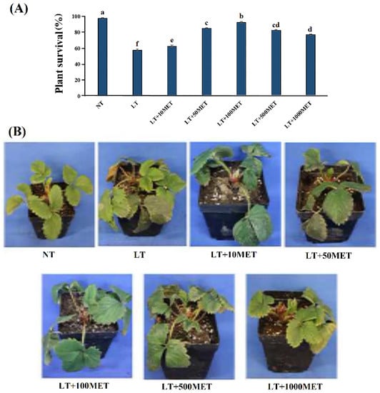 Effects of exogenous application of melatonin on plant survival (%) (A) and growth (B) of strawberry seedlings under cold stress. Plants treated with distilled water under the normal conditions (25 °C) served as control (NT). The strawberry seedlings were pretreated with distilled water (LT), 10 μM melatonin (LT + 10MET), 50 μM melatonin (LT + 50MET), 100 μM melatonin (LT + 100MET), 500 μM melatonin (LT + 500MET), and 1000 μM melatonin (LT + 1000MET) 3 times in a two-day interval and then exposed to cold stress for 2 days. Graphs represent the mean of three biological replicates. Values labeled with different letters indicate significant differences among treatments at (p ≤ 0.05) by LSD.