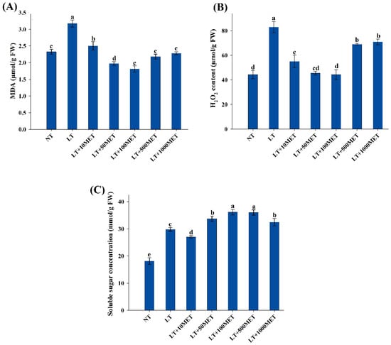 Effects of exogenous melatonin on MDA (A), H2O2 (B), and soluble sugar concentrations (C) in strawberry seedlings under cold stress. Plants treated with distilled water under the normal conditions (25 °C) served as control (NT). The strawberry seedlings were pretreated with distilled water (LT), 10 μM melatonin (LT + 10MET), 50 μM melatonin (LT + 50MET), 100 μM melatonin (LT + 100MET), 500 μM melatonin (LT + 500MET), and 1000 μM melatonin (LT + 1000MET) 3 times in a two-day interval and then exposed to cold stress for 2 days. Graphs represent the mean of three biological replicates. Values labeled with different letters indicate significant differences among treatments at (p ≤ 0.05) by LSD.