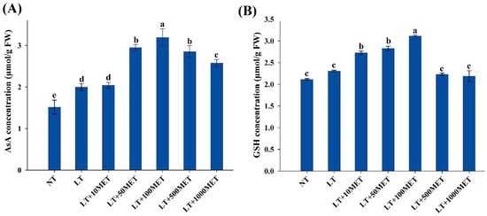 Effects of exogenous melatonin on non-enzymatic antioxidants (AsA (A) and GSH (B)) in strawberry seedlings under cold stress. Plants treated with distilled water under the normal conditions (25 °C) served as control (NT). The strawberry seedlings were pretreated with distilled water (LT), 10 μM melatonin (LT + 10MET), 50 μM melatonin (LT + 50MET), 100 μM melatonin (LT + 100MET), 500 μM melatonin (LT + 500MET), and 1000 μM melatonin (LT + 1000MET) 3 times in a two-day interval and then exposed to cold stress for 2 days. Graphs represent the mean of three biological replicates. Values labeled with different letters indicate significant differences among treatments at (p ≤ 0.05) by LSD.