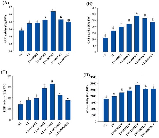 Effects of exogenous melatonin on the activities of antioxidant enzymes (APX (A) CAT (B), POD (C), and SOD (D)) in strawberry seedlings under cold stress. Plants treated with distilled water under the normal conditions (25 °C) served as control (NT). The strawberry seedlings were pretreated with distilled water (LT), 10 μM melatonin (LT + 10MET), 50 μM melatonin (LT + 50MET), 100 μM melatonin (LT + 100MET), 500 μM melatonin (LT + 500MET), and 1000 μM melatonin (LT + 1000MET) for 3 times in a two-day interval and then exposed to cold stress for 2 days. Graphs represent the mean of three biological replicates. Values labeled with different letters indicate significant differences among treatments at (p ≤ 0.05) by LSD.
