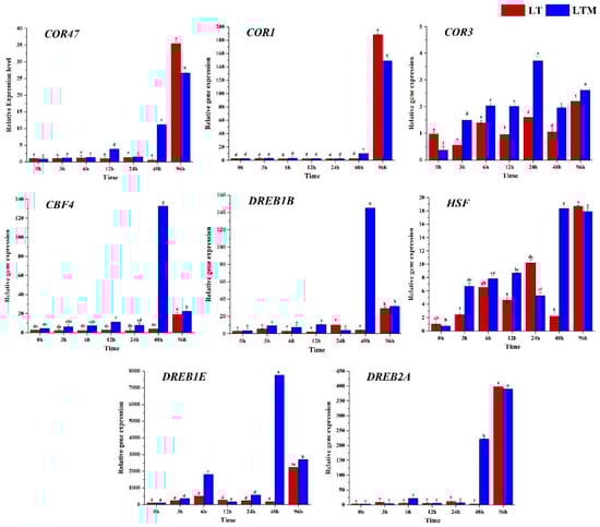 Expression of cold-related genes in leaves of strawberry under cold stress. The strawberry seedlings were pretreated with distilled water (LT) or 100 μM melatonin (LTM) 3 times in a two-day interval and then exposed to cold stress for 2 days. Samples were taken at 0, 3, 6, 12, 24, 48, and 96 h after cold treatment. Graphs represent the mean of three biological replicates. Values labeled with different letters indicate significant differences among treatments at (p ≤ 0.05) by LSD.