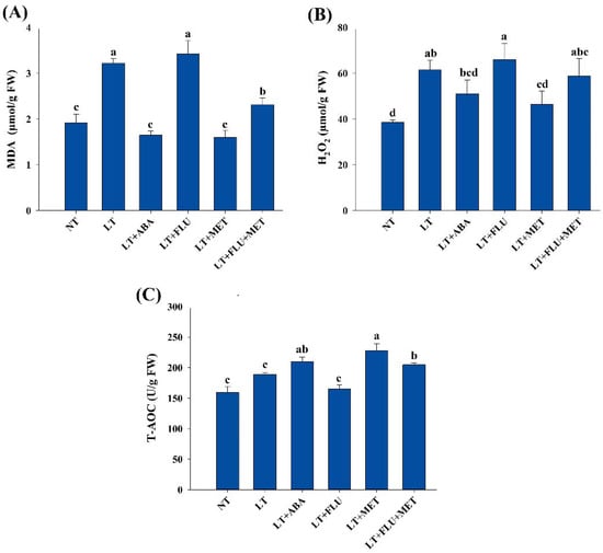 Effects of exogenous melatonin and ABA on melatonin on MDA (A), H2O2 (B), and total antioxidant capacity (T-AOC) (C) in strawberry seedlings under cold stress. Plants treated with distilled water under the normal conditions (25 °C) served as control (NT). The strawberry seedlings were pretreated with distilled water (LT), 100 μM ABA (LT + ABA), 50 μM fluridone (LT + FLU), 100 μM melatonin (LT + MET), and 50 μM fluridone + 100 μM melatonin (LT + FLU + MET) 3 times in a two-day interval and then exposed to cold stress for 2 days. Graphs represent the mean of three biological replicates. Values labeled with different letters indicate significant differences among treatments at (p ≤ 0.05) by LSD.