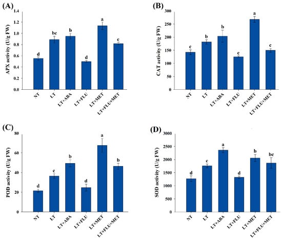 Effects of exogenous melatonin and ABA on the activities of antioxidant enzyme (APX (A), CAT (B), POD (C), and SOD (D)) in strawberry seedlings under cold stress. Plants treated with distilled water under the normal conditions (25 °C) served as control (NT). The strawberry seedlings were pretreated with distilled water (LT), 100 μM ABA (LT + ABA), 50 μM fluridone (LT + FLU), 100 μM melatonin (LT + MET), and 50 μM fluridone + 100 μM melatonin (LT + FLU + MET) 3 times in a two-day interval and then exposed to cold stress for 2 days. Graphs represent the mean of three biological replicates. Values labeled with different letters indicate significant differences among treatments at (p ≤ 0.05) by LSD.