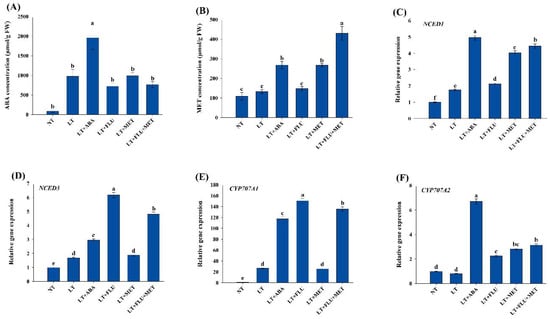 Effects of exogenous melatonin and ABA treatment on the endogenous ABA concentration (A), MET concentration (B), relative expressions of NCED1 (C), NCED3 (D), CYP707A1 (E), and CYP707A2 genes (F) in strawberry seedlings under cold stress. Plants treated with distilled water under the normal conditions (25 °C) served as control (NT). The strawberry seedlings were pretreated with distilled water (LT), 100 μM ABA (LT + ABA), 50 μM fluridone (LT + FLU), 100 μM melatonin (LT + MET), and 50 μM fluridone + 100 μM melatonin (LT + FLU + MET) 3 times in a two-day interval and then exposed to cold stress for 2 days. Graphs represent the mean of three biological replicates. Values labeled with different letters indicate significant differences among treatments at (p ≤ 0.05) by LSD.