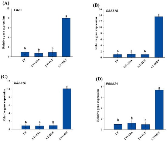 Effects of exogenous melatonin and ABA treatment on cold-related genes; transcript levels of CBF4A (A), DREB1B (B), DREB1E (C), and DREB2A (D) in strawberry seedlings under cold stress. The strawberry seedlings were pretreated with distilled water (LT), 100 μM ABA (LT + ABA), 50 μM fluridone (LT + FLU), 100 μM melatonin (LT + MET), and 50 μM fluridone + 100 μM melatonin (LT + FLU + MET) 3 times in a two-day interval and then exposed to cold stress for 2 days. Graphs represent the mean of three biological replicates. Values labeled with different letters indicate significant differences among treatments at (p ≤ 0.05) by LSD.