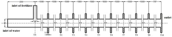 Experiments were conducted to explore the water–fertilizer mixing law in the irrigation pipe after the fertilizer solution was injected into the pipeline and investigate the effect of pipeline structure parameters, hydraulic parameters, and fertilizer physical properties on the mixing uniformity. The pipeline structure parameters included the water pipe diameter (D) and fertilizer pipe diameter (d). The hydraulic parameters consisted of the water flow rate (Q), fertilizer flow rate (q), and fertilizer injection frequency (f). The fertilizer physical properties included the fertilizer concentration (C) and fertilizer viscosity (η). The experimental equipment site is shown in Figure 1. A water tank with a volume of 5 m3 was adopted as the water source. The centrifugal pump (CM5-6, Grundfos, Denmark) and flowmeter (CKLDG/LDG, China, accuracy of ±0.5%) were used to supply water to the pipe system and display the water flow rate. Fertilizer was injected into the pipe system using a plunger pump (WEILI, China, maximum flow rate of 0.3 m3h−1). Considering the practical engineering application, the pipe was produced by polyethylene materials. To master the fertilizer distribution law in the pipe, 20 sampling pipes with ball values were fixed in the upper and lower sections of the straight pipe. The arrangement of sampling points is shown in Figure 2. The center line of the thin standpipe, which was set for injecting fertilizer solution, was established as Y0. Sampling positions were then arranged every 1 m from the Y0 position. Two sampling pipes that were 6 mm in diameter and length of 40 mm long were established at the upper and lower areas of the sampling position.