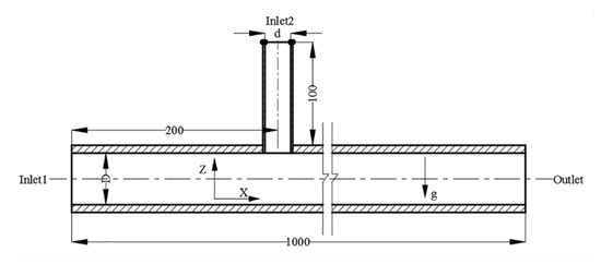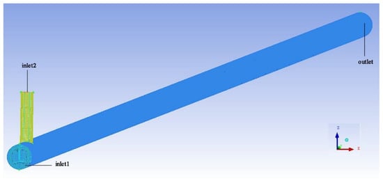 Based on the geometric model and pipe parameters shown in Table 2, numerical models of the inner flow channel of the mixing pipeline were constructed in the ICEM module of Ansys software (version of 17.0, ANSYS, America). Hexahedral meshes were used to construct the numerical model, and boundary layer meshes were refined to improve the accuracy of simulation. One of the numerical models (D1d1) is shown in Figure 5. The diameter of inlet1 and inlet2 were 0.050 and 0.025 m, respectively, and the total number of cells was 2,432,007.