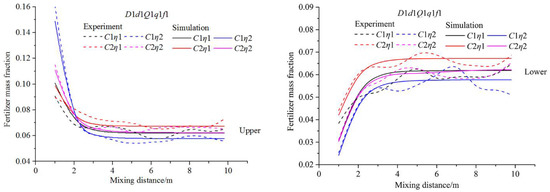 The experimental data were transferred to the fertilizer mass fraction. The fertilizer mass fraction at the same position as the experimental sampling point in the simulation results were collected and drawn in Figure 6. The variation trend of the fertilizer mass fraction along the mixing distance in the simulation result was almost identical with that in the experimental results in all four cases. As shown, the deviation between the simulated and experimental results was the largest at the upper section of the Y1 position in the C1η1 condition and reached 20.55%. In addition, there were five other deviations >10%, but the other 74 deviations were all <10%. The average deviation was 5.71%, which was far less than 10%. Therefore, the accuracy of the simulation results was acceptable, and the simulation methods proposed in this research were feasible to simulate the mixing law after the fertilizer solution was injected into the pipe system.