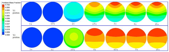 The first conducted simulation (condition of D1d1Q1q1C1η1f1) was chosen as an example to investigate the fertilizer–water mixing state in the pipes at different positions and time. The result is shown in Figure 7, where it was found that the fertilizer did not move to the Y1 position when it was injected for 1.5 s. The fertilizer mass fraction was 0.009–0.037 on the radial section at 2 s, indicating that a small amount of fertilizer had moved to the Y1 position as the water flowed. During 2 s and 2.5 s, more fertilizer moved to the Y1 position, and it presented a gradient distribution on the radial section. This results were kept consistent with a finding proposed by Widiatmojo et al. [22], who investigated the diffusion of a solute in turbulent flows through a circular pipe. Duda et al. [23] also reported that the concentration showed a gradient distribution when the polymer diffused in the solvent. The fertilizer mass fraction at the top of the section increased slightly when the time changed from 2.5 s to 3 s. After 3 s, the fertilizer mass fraction remained unchanged in the whole radial section. Similarly, on the radial section at the Y2 section, no fertilizer passed through the Y2 position during the first 3 s. Subsequently, the fraction of fertilizer mass increased, distributed in the gradient, and did not change after 4.5 s. After the flow in the pipe was stable, the fertilizer mass fraction at any position did not change with time in the areas where the fertilizer had flowed.
