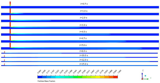 Figure 8 shows the distribution of the fertilizer mass fraction along the axis direction at different times after it had been injected into the pipeline. As shown, the fertilizer entered the water pipe after it was injected for 0.5 s. At any time, the fertilizer mass fraction of the area near the fertilizer pipe was high. It then decreased at the axial direction and the radial direction because as time progressed, the fertilizer would flow with water to the outlet and move in the radial direction. A comparison of the results at 4.0, 4.5, and 5.0 s indicated that the fertilizer mass fraction did not reach the same level along the radial direction at 4.0 s, but did at 4.5 s. Compared with 4.5 s, the fertilizer just continued to move toward the outlet at 5.0 s, and the change in the radial direction was almost invisible, as were the simulation results after 5.0 s. Moreover, the fertilizer had moved to the position that was closest to the outlet at 12.0 s and had filled the whole pipe system at 15.0 s.