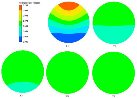 The fertilizer mass fraction at any position did not change with time in areas where the fertilizer had flowed, and the fertilizer moved to the outlet in 15 s. Therefore, the simulation results at 15 s were selected as examples to investigate the distribution of fertilizer in the radial direction, obtain the COV variation, and confirm the uniform mixing length, the results of which are shown in Figure 9 and Figure 10. The fertilizer mass fraction on the radial section was symmetrical along the radial direction. In the upper half of the pipe, the fertilizer mass fraction deceased with the extension of the mixing length, while increased in the lower half. After Y4, the fertilizer mass fraction on the radial section was basically the same, indicating that the fertilizer had uniformly mixed with water between 3 and 4 m. Finally, the fertilizer mass fraction can be calculated using the following equation: