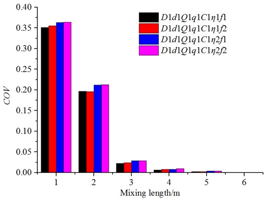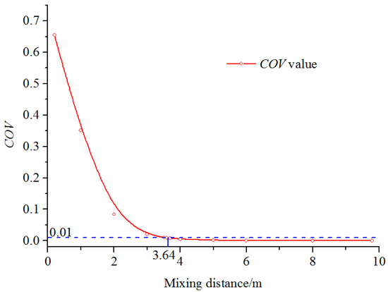 where ρf (kgm−3) is the density of the fertilizer. Substituting the parameters of the D1d1Q1q1C1η1f1 condition into Equation (14) resulted in a fertilizer mass fraction of 0.619, which was the same as that shown in Figure 9. The COV values of some of the axis positions were calculated using Equation (1), and the results are shown in Figure 10. It was obvious that the COV value decreased sharply at first and then slowly as the mixing length increased. The uniform mixing length of the D1d1Q1q1C1η1f1 condition was 3.64 m.