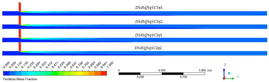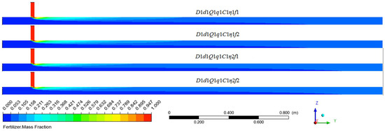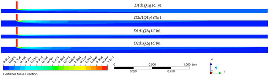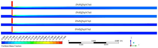 The fertilizer distribution along the water pipe under different flow rates of water and water pipe diameters are shown in Figure 15, which compares the simulation results of D1d1Q1q1C1η1, D2d1Q1q1C1η1, D1d1Q2q1C1η1, and D2d1Q2q1C1η1. It was apparent that as the water pipe diameter increased and the water flow rate decreased, the fertilizer moved a longer distance along the Z direction at the same axis position, and so the mixing speed at the radial direction was faster. The mixing length that resulted in the fertilizer mass fraction being at the same level was more backward when the water flow rate and the water pipe diameter were larger. Figure 16 indicates the COV variation along the axis of the water pipe under four working conditions. When examined at the same axis position, larger flow rates and larger water pipe diameters resulted in a higher COV value. The uniform mixing length under the four working conditions, from long to short, were D2Q2, D2Q1, D1Q2, and D1Q1. Thus, the uniform mixing length was proportional to the water pipe diameter and flow rates of water.