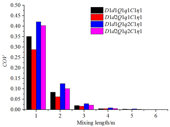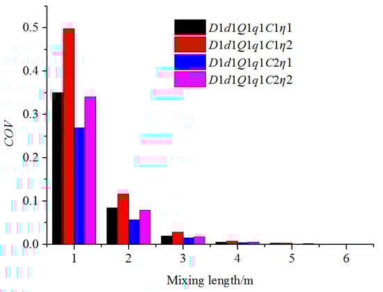 The distribution of fertilizer mass fraction along the water pipe under different fertilizer pipe diameters and fertilizer flow rates is shown in Figure 13. The fertilizer was found to mix with water faster at the radial direction with the increase in the fertilizer flow rate and the decrease in the diameter of the fertilizer pipe. This was because a larger flow rate and a smaller fertilizer pipe diameter resulted in an increase in the speed of fertilizer that was injected into the pipe, enabling the fertilizer to move a longer distance along the radial direction within the same amount of time. In these four conditions, the mixing distance that enabled the fertilizer mass fraction to be at the same level differed significantly. Smaller fertilizer flow rates and a larger diameter of the fertilizer pipe resulted in a longer uniform mixing length. Figure 14 shows the COV variation along the mixing distance under different fertilizer pipe diameters and fertilizer flow rates. The COV value at the same axis position decreased with the increase in the fertilizer flow rates and a reduction in the diameter of the fertilizer pipe, which also indicated that the uniform mixing length would be long when the fertilizer pipe was large, and the fertilizer flow rates were small. With the increase in the mixing length, the COV gap of four conditions narrowed. For example, when the mixing length was 1 m, the COV value of D1d2Q1q1C1η1 was 0.063 less than that of D1d1Q1q1C1η1, but 0.022 less when the mixing length exceeded 2 m. The uniform mixing length was between 3 and 4 m in all four working conditions.