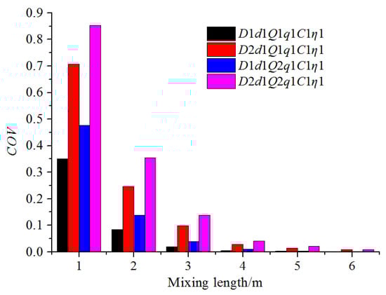 COV variation along the mixing distance under different flow rates of water and water pipe diameters.